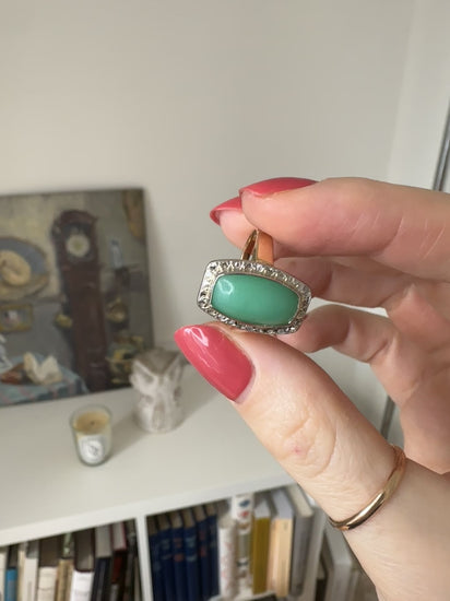 Antique ring in 18kt yellow gold and platinum (hallmark: owl and mascaron), set in its center with a rectangular cabochon of chrysoprase, in a surround of rose-cut diamonds, estimated to weigh approx. 0.10 cts.