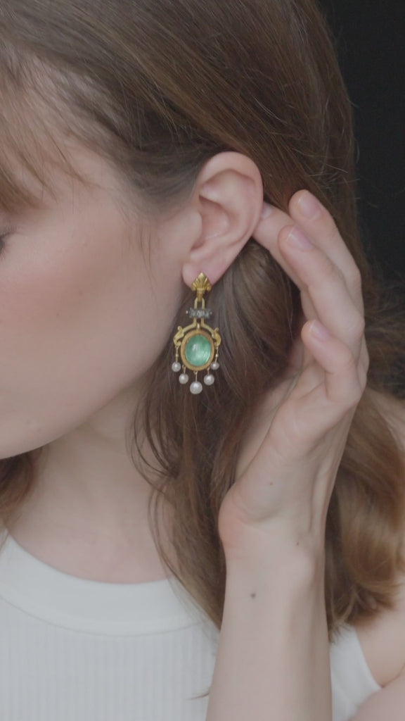 Pair of 18kt yellow gold and silver earrings (hallmark: eagle head) adorned with emerald cabochons, total weight approx. 5.00 Cts, rose-cut diamonds, and fine pearls.