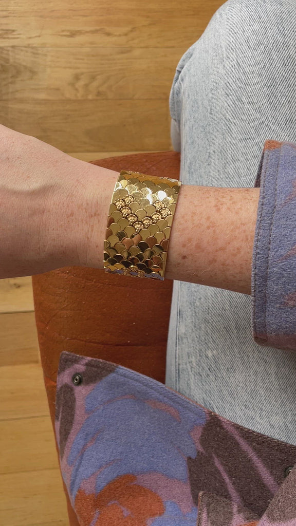 Flexible cuff bracelet in 18Kt yellow gold (hallmark: owl), with flat mesh featuring scales and chased shells.