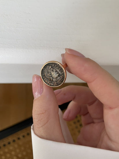18kt rose gold ring (hallmark: owl) set with an antique Roman copper coin.