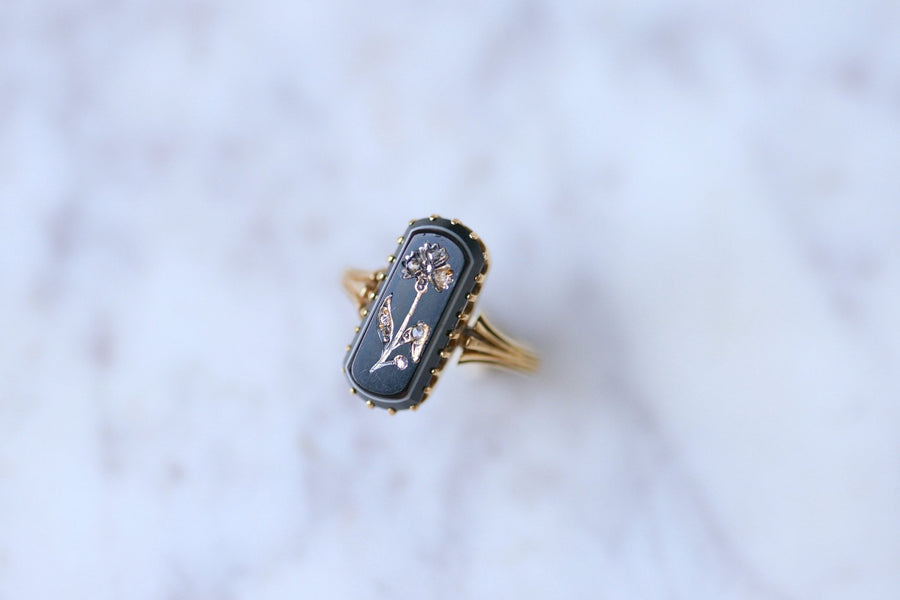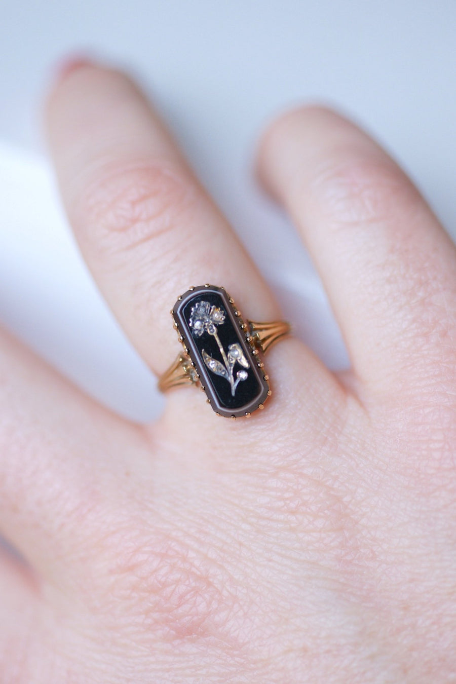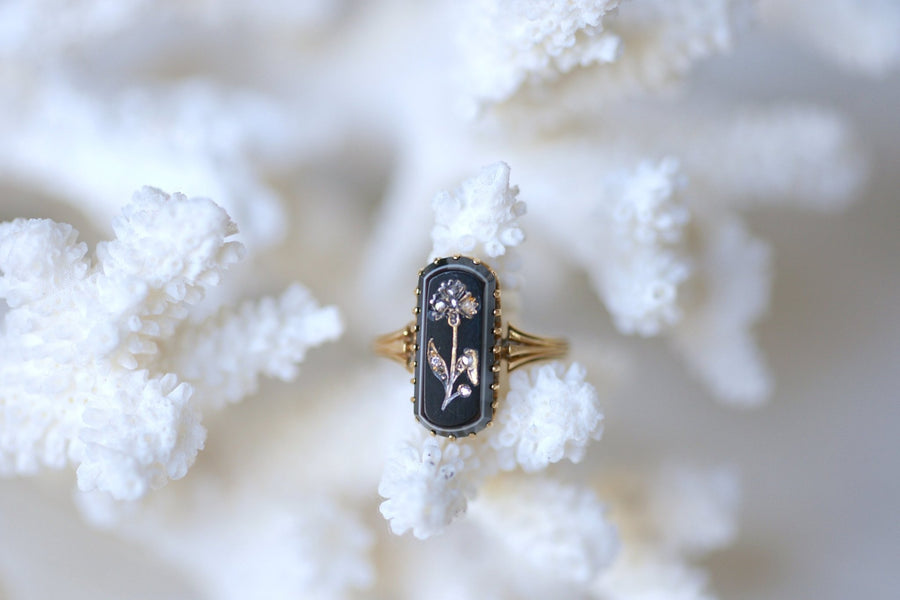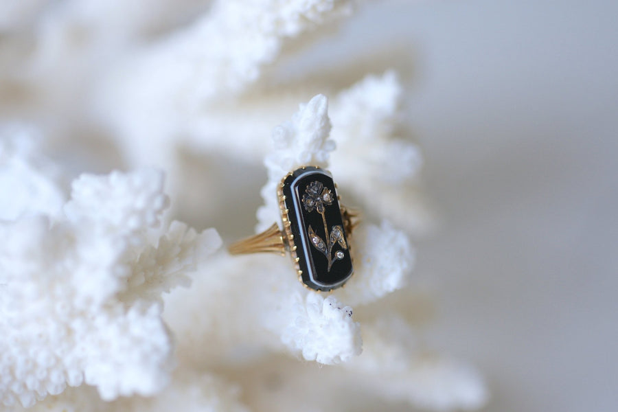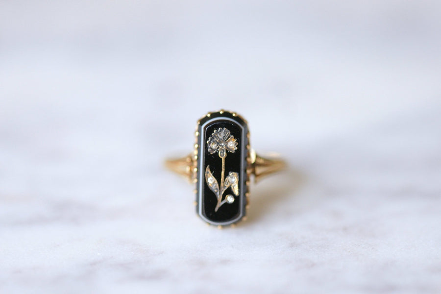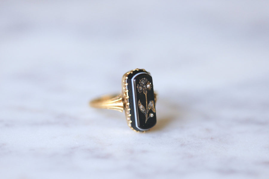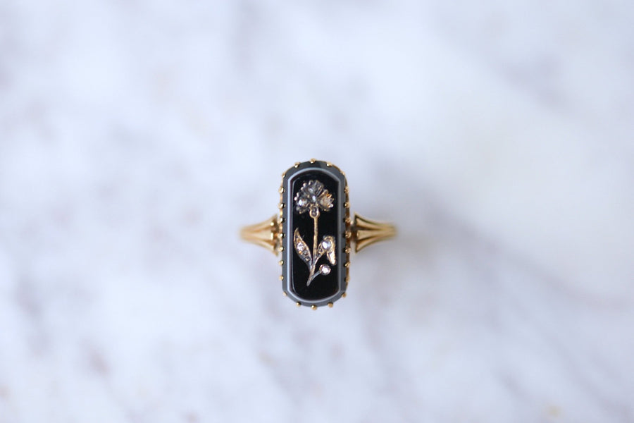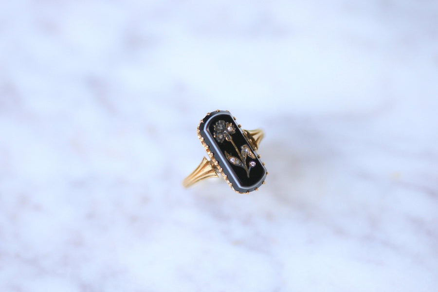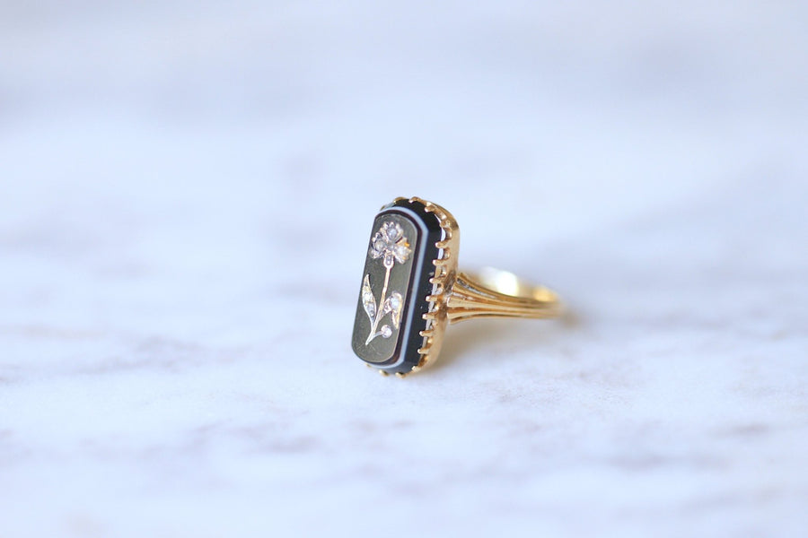 Rare 18kt yellow gold (hallmark: eagle's head) Victorian ring set with a carved agate intaglio showing a carnation flower paved with rose cut diamonds.
