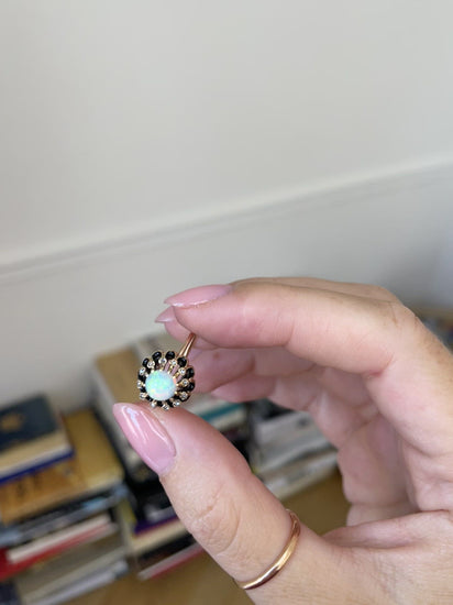 Antique 18Kt rose gold engagement ring (punch: owl)The center is decorated with an opal cabochon in a setting of rose-cut diamonds and black enamel.