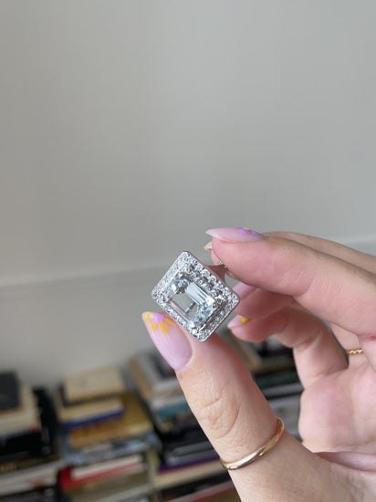 An Art Deco engagement ring in white gold and platinum (hallmarks: eagle head and dog), with an emerald-cut aquamarine weighing approximately 4.50 cts in the centre, set in a double border of 8X8 diamonds (estimated to weigh approximately 0.70 ct).
