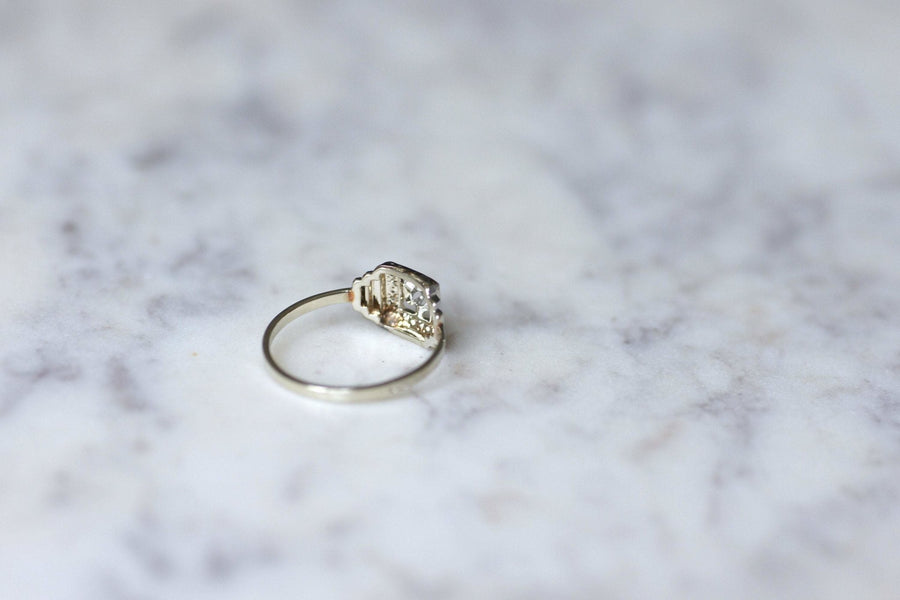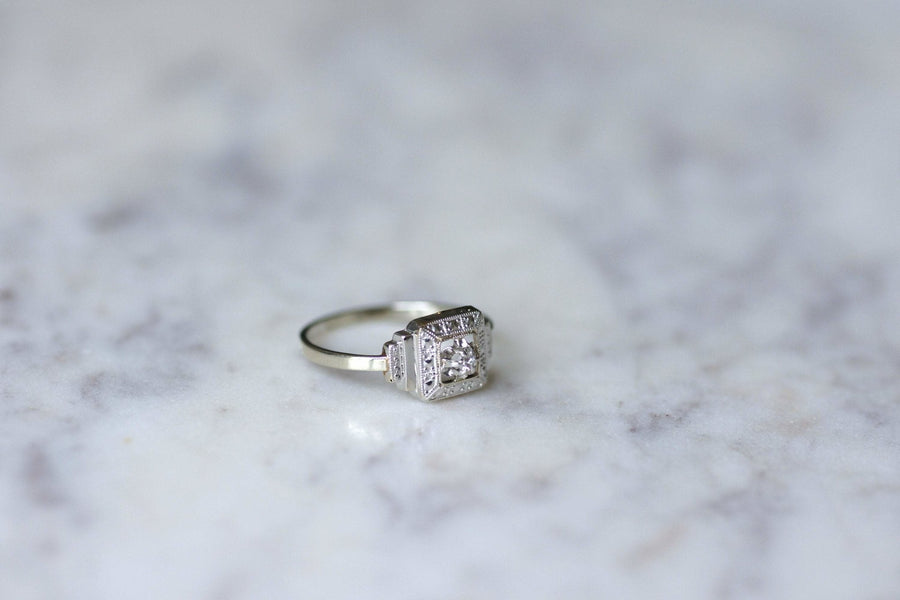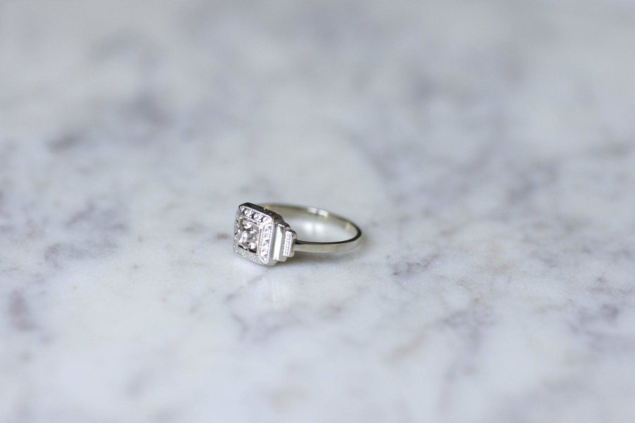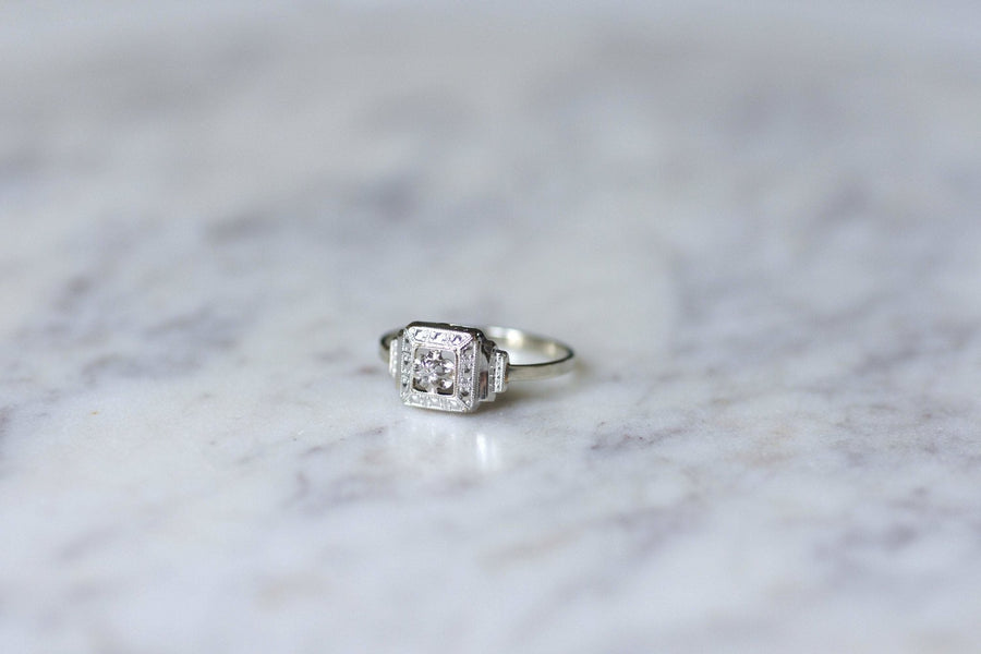 An 18kt white gold and platinum Art Deco engagement ring (eagle head and dog stamp) set with a 8X8 diamond in the centre, weighing approximately 0.05 ct.