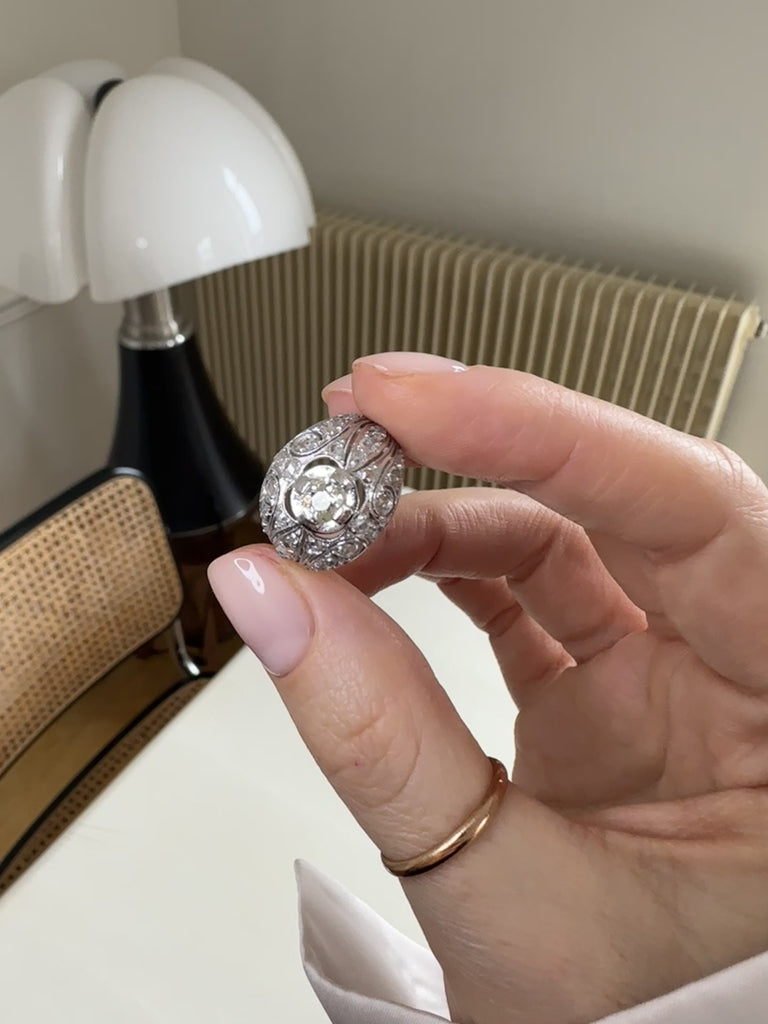 Dome ring in 18kt white gold and platinum (hallmarks: dog head and eagle head) set in its center with an old-cut diamond, estimated to weigh approx. 0.40 Ct (estimated color K, estimated clarity I), in a surround of rose-cut diamonds estimated to weigh approx. 0.35 Ct.