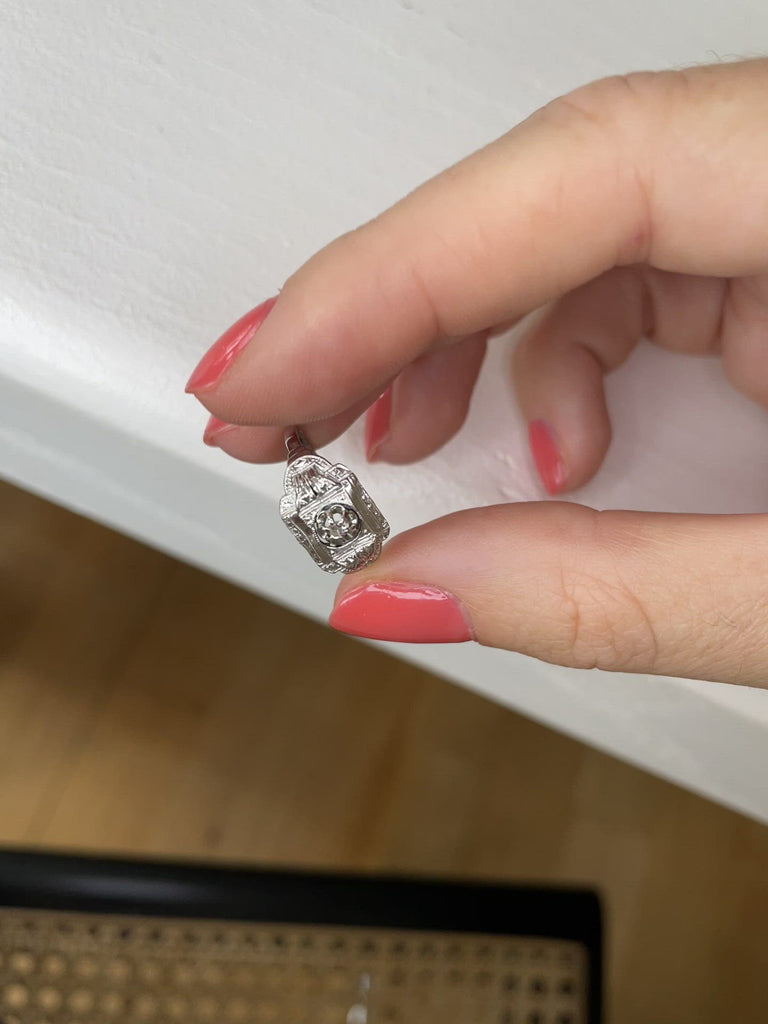 Art Deco engagement ring in platinum and 18Kt white gold (hallmark: eagle head and dog), set with an 8x8 diamond.