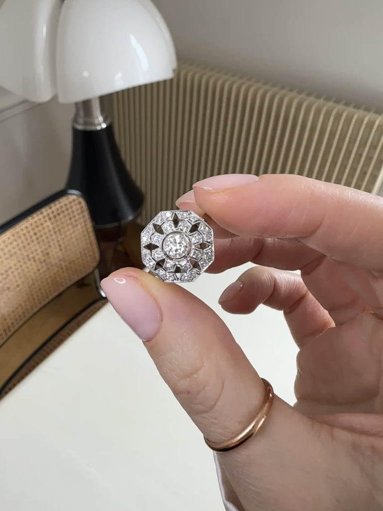Octagonal openwork engagement ring in 18Kt white gold and platinum, (hallmarks: dog and eagle), set in its center with an old-cut diamond weighing approx. 0.30 Ct (estimated color I, estimated clarity SI) in a surround of 8x8 cut diamonds, the total weight of which is estimated at approx. 0.40 Ct.