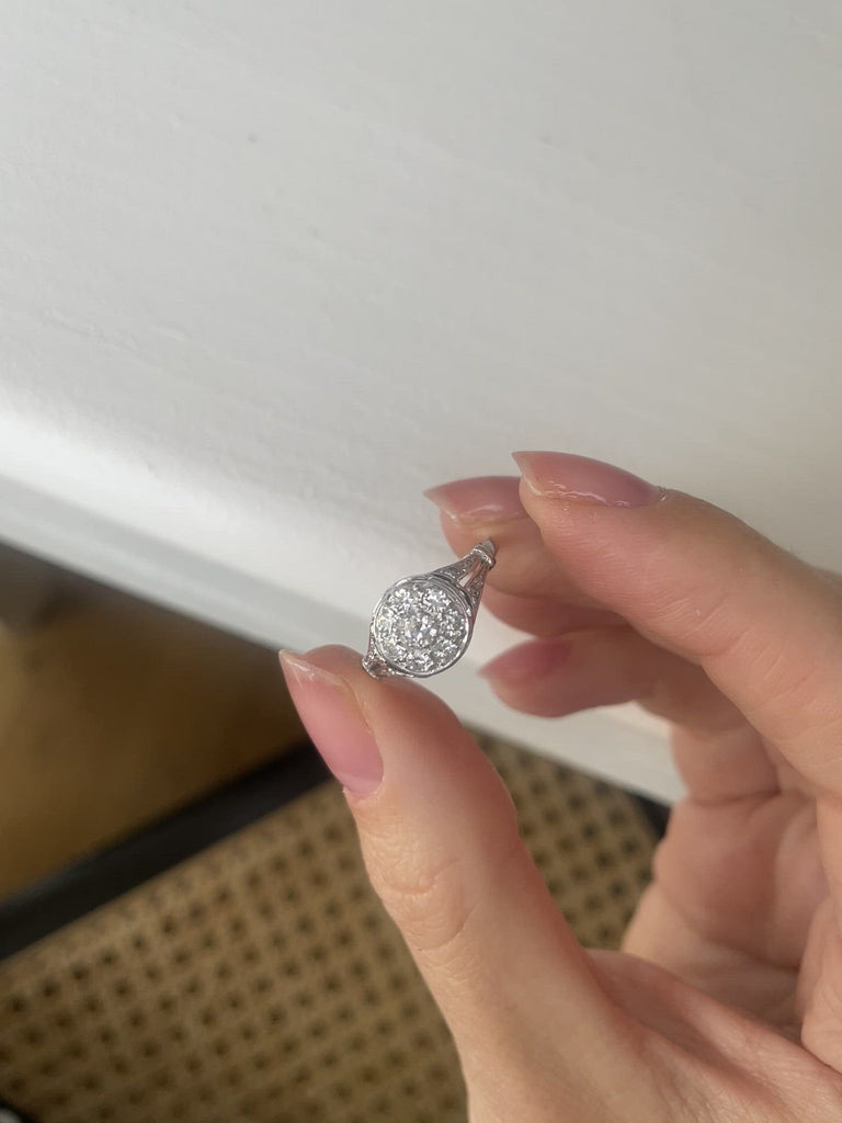 Art Deco round engagement ring in 18kt white gold and platinum (hallmark: eagle and dog), set with half-cut diamonds in the centre and 8x8 and rose-cut diamonds on the sides.
