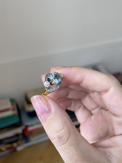 Condition: slight micro-scratches and oxidation on the gold and platinum parts, wear on the setting, and abrasion on the aquamarine, see pictures.