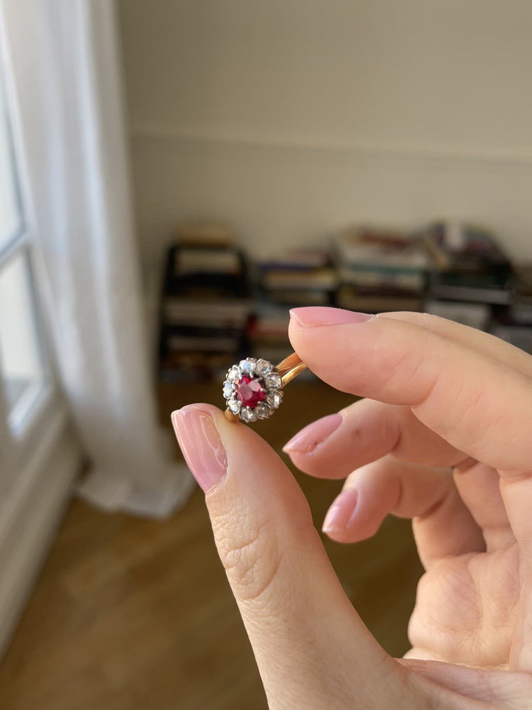 Antique 18 kt yellow gold and platinum (eagle hallmark) engagement ring with a red spinel in the centre, weighing approximately 0.75 ct, set in rose-cut diamonds (total diamond weight estimated at 0.20 ct apx).