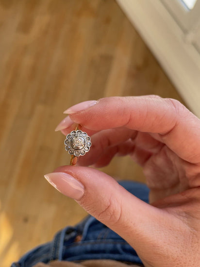 18kt yellow gold and platinum (eagle head hallmark) daisy ring set in its centre with a diamond, weighing approximately 0.15 Ct, colour estimated H, clarity estimated SI, in a setting of rose-cut diamonds whose total weight is estimated at approximately 0.20 Ct.