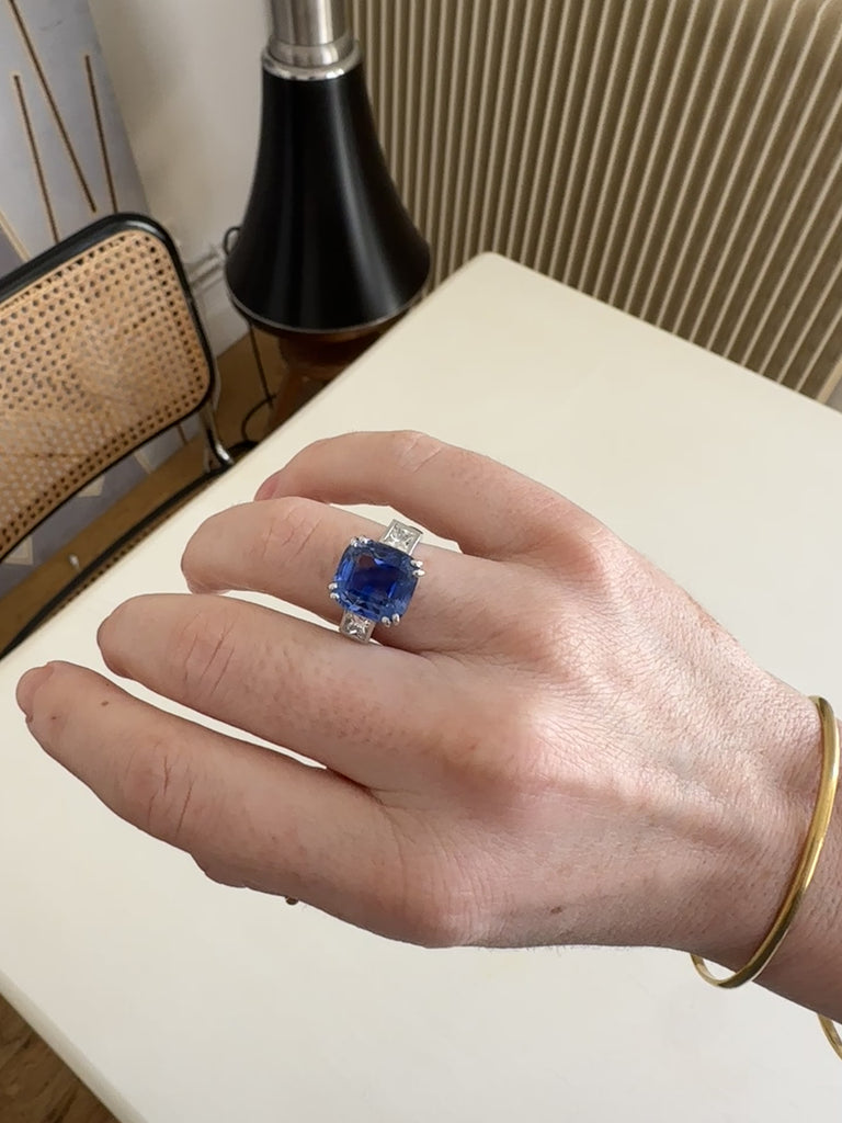 Superb ring in 18kt white gold (hallmark: eagle head), the center of which is set with a cushion-cut, intense blue Ceylon sapphire weighing 7.94 cts.