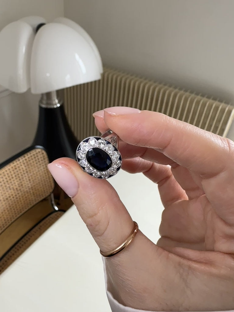 Engagement ring in 18Kt white gold and platinum (hallmarks: owl and mascaron), the center of which is set with a natural oval sapphire weighing approx. 2.00 Cts, in a setting of old-cut diamonds and triangle-cut sapphires (probably synthetic). Rose-cut diamonds on the shoulders.