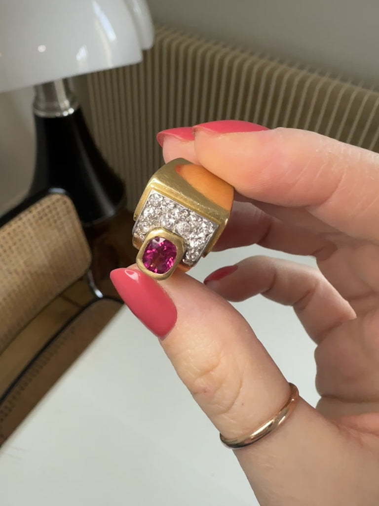 Tank ring in 18Kt yellow gold and platinum (hallmarks: hibou and mascaron), adorned with a beautiful oval pink tourmaline weighing approximately 1.00 Ct, and pavement-cut diamonds, estimated to weigh around 0.85Ct.