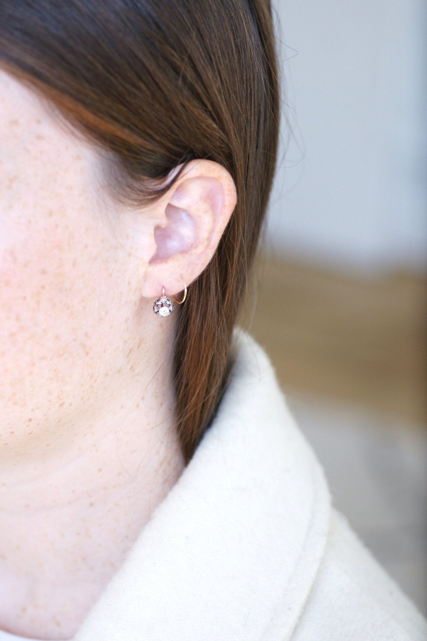 18kt rose gold and platinum (hallmark: horse's head) sleeper earrings adorned with two old-cut diamonds whose total weight is estimated at approx. 0.55 Ct (estimated color H and J/estimated clarity VS), surmounted by two small rose-cut diamonds.