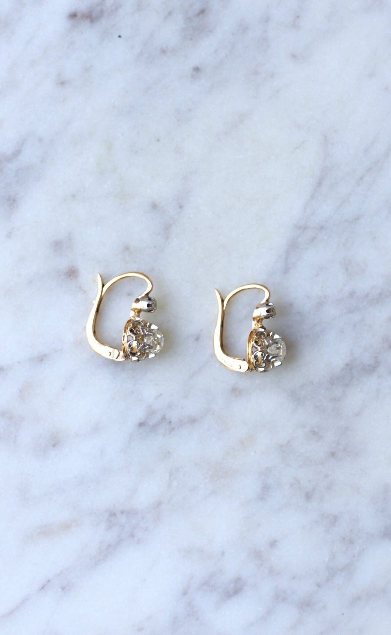 18kt rose gold and platinum (hallmark: eagle head) sleeper earrings adorned with two old-cut diamonds estimated to total approx. 0.70 ct (estimated color I/ estimated clarity SI), set off by two small rose-cut diamonds.