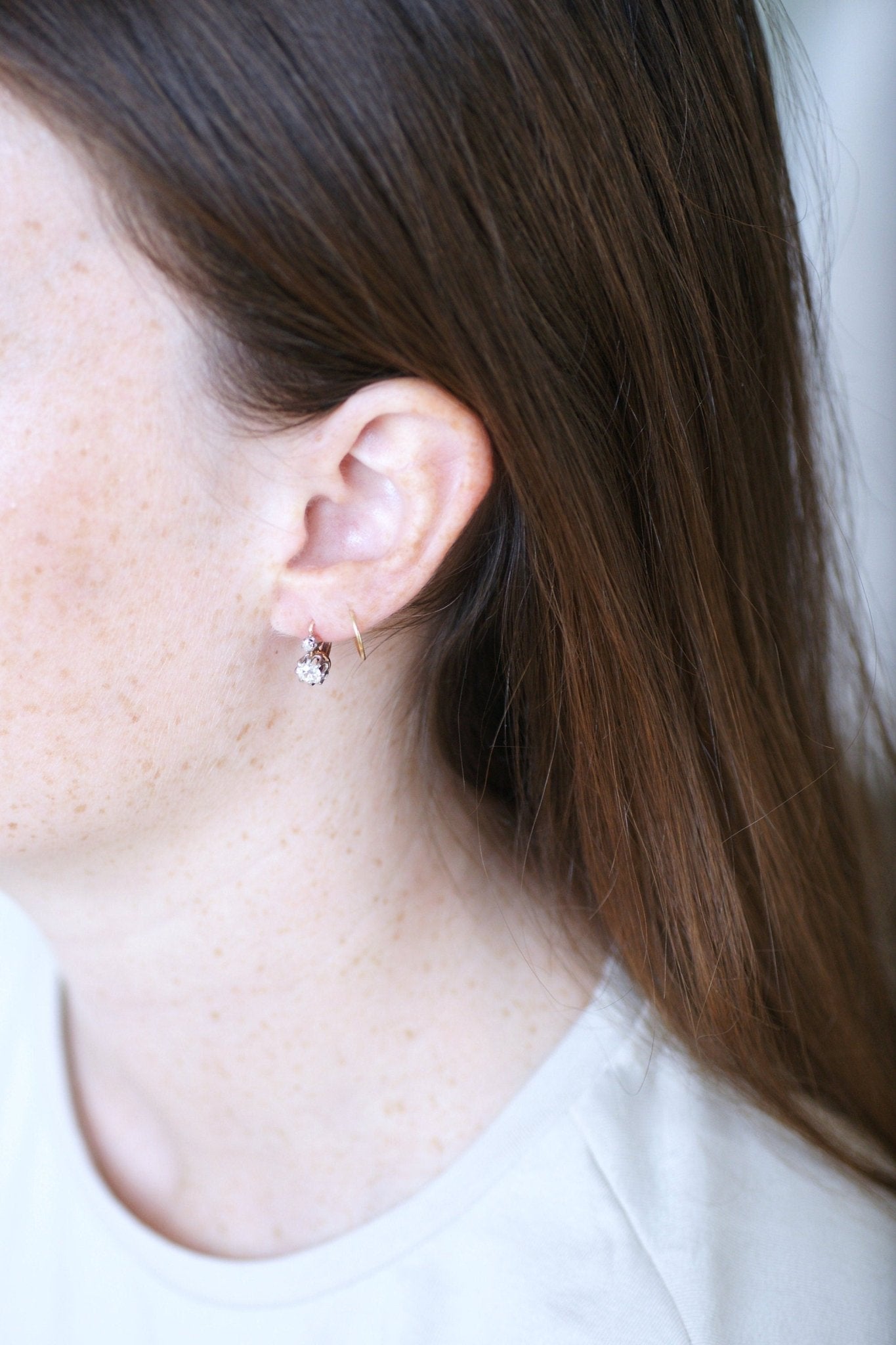 18kt rose gold and platinum (hallmark: eagle head) sleeper earrings adorned with two old-cut diamonds, total estimated weight approx. 0.85 ct (estimated color I/ estimated clarity VS and SI), set off by two small old-cut diamonds.