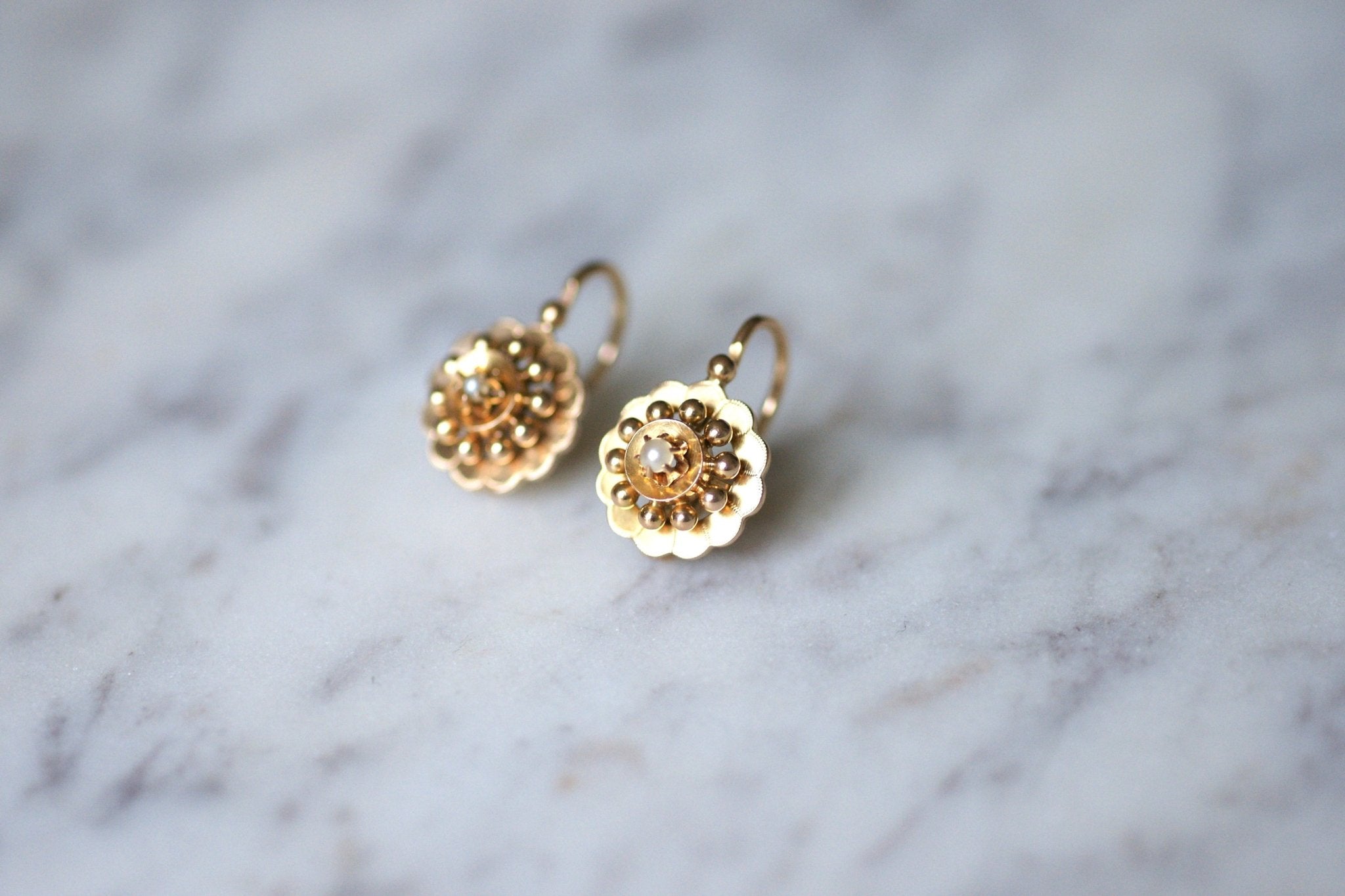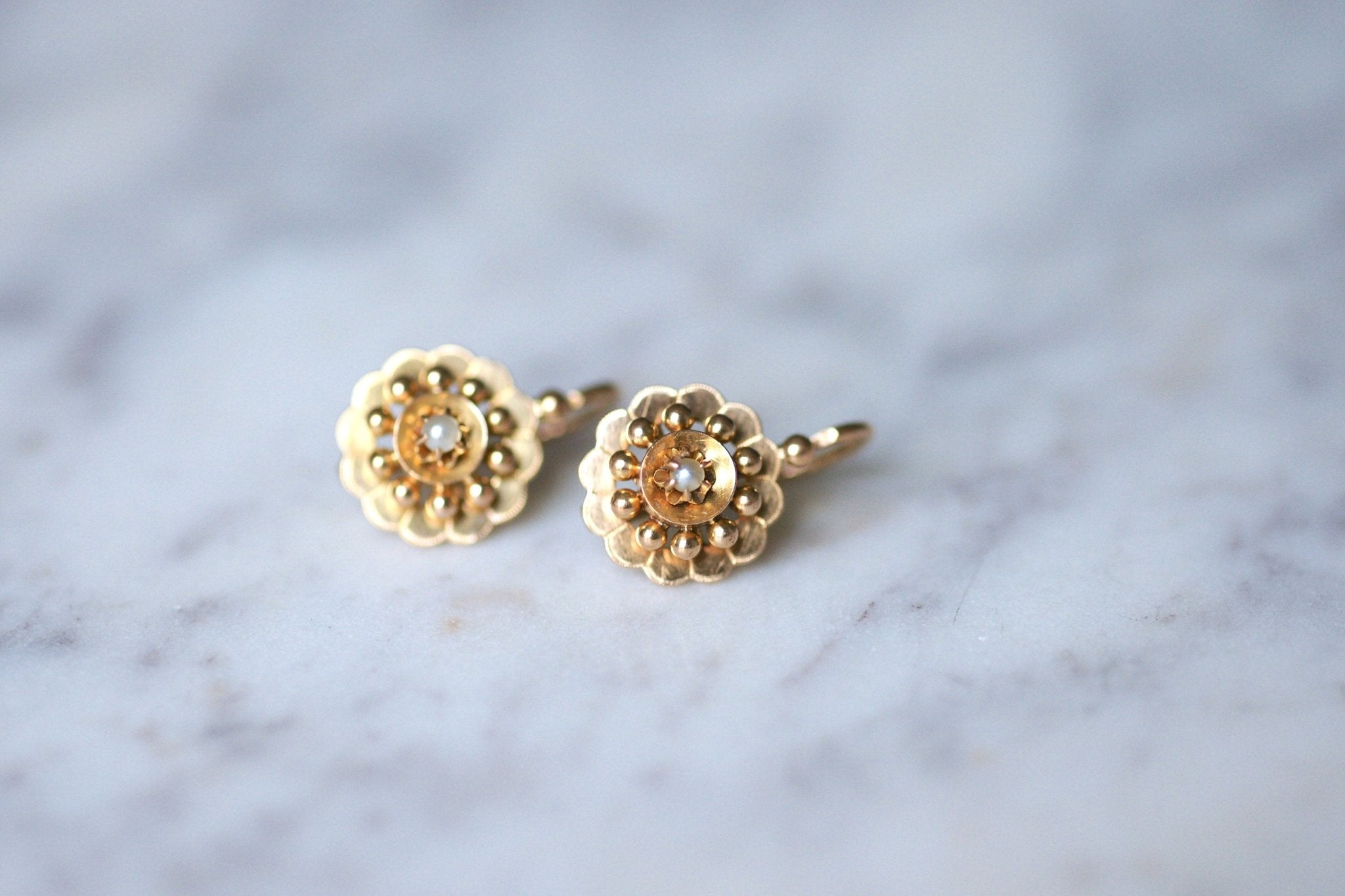Sleeper earrings in 18kt rose gold (eagle head punch) in the shape of flowers decorated in their center with a small fine pearl.