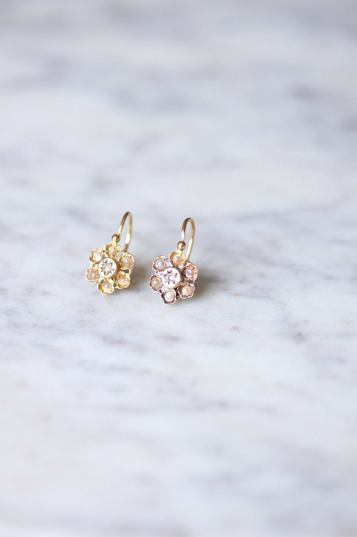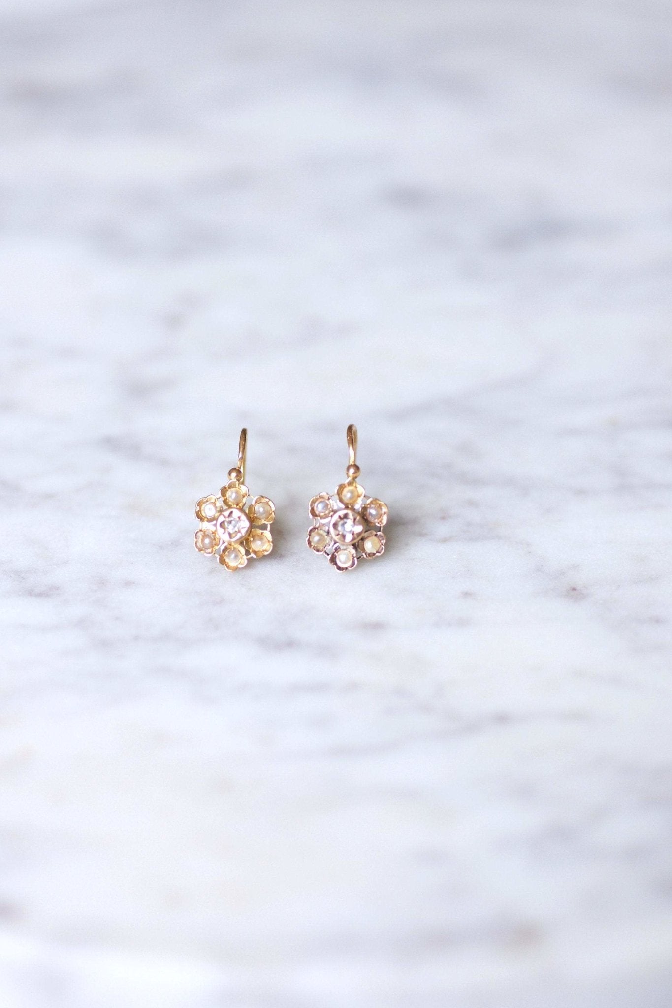 18kt rose gold (horse head hallmark) flower-shaped sleeper earrings adorned with small pearls and a rose-cut diamond in its center.