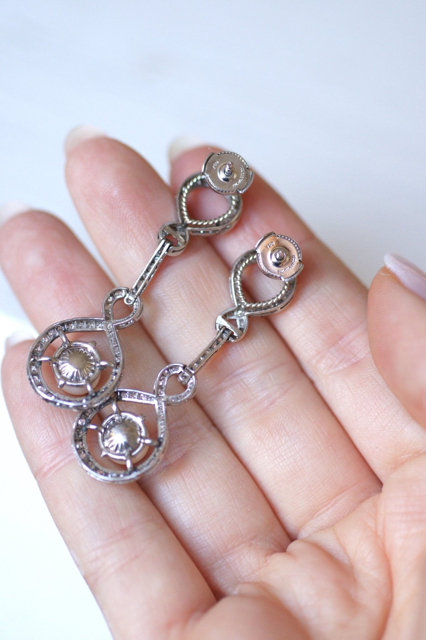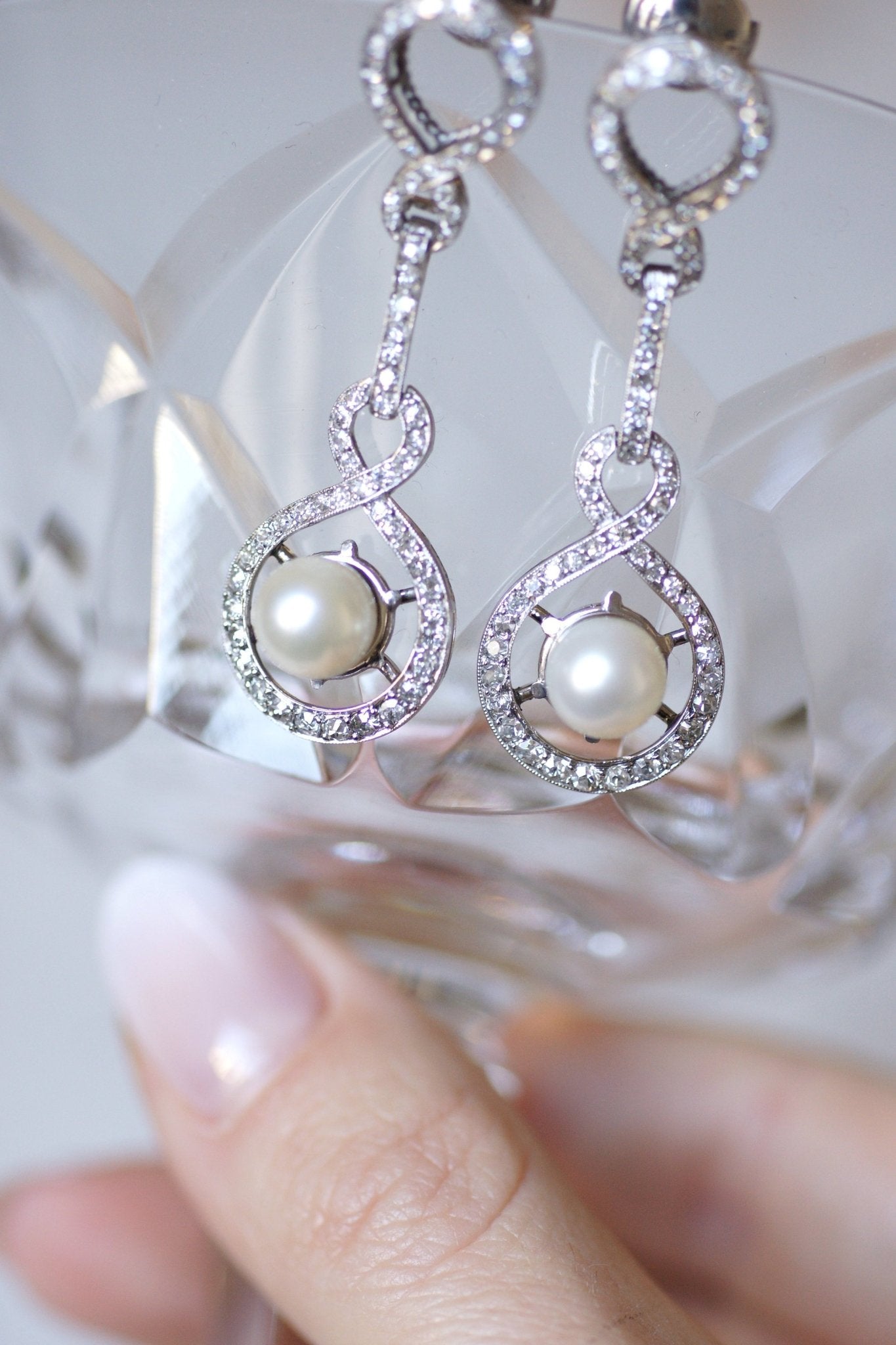Art Deco style drop earrings, platinum, diamonds, and pearls