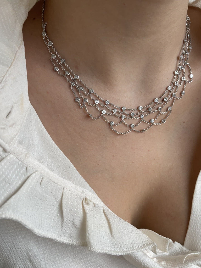 This necklace model draws its inspiration from the fishnet style of the Belle Epoque, a style in which white metals and diamonds are perfectly combined, always with a light touch.