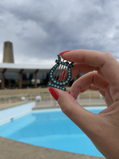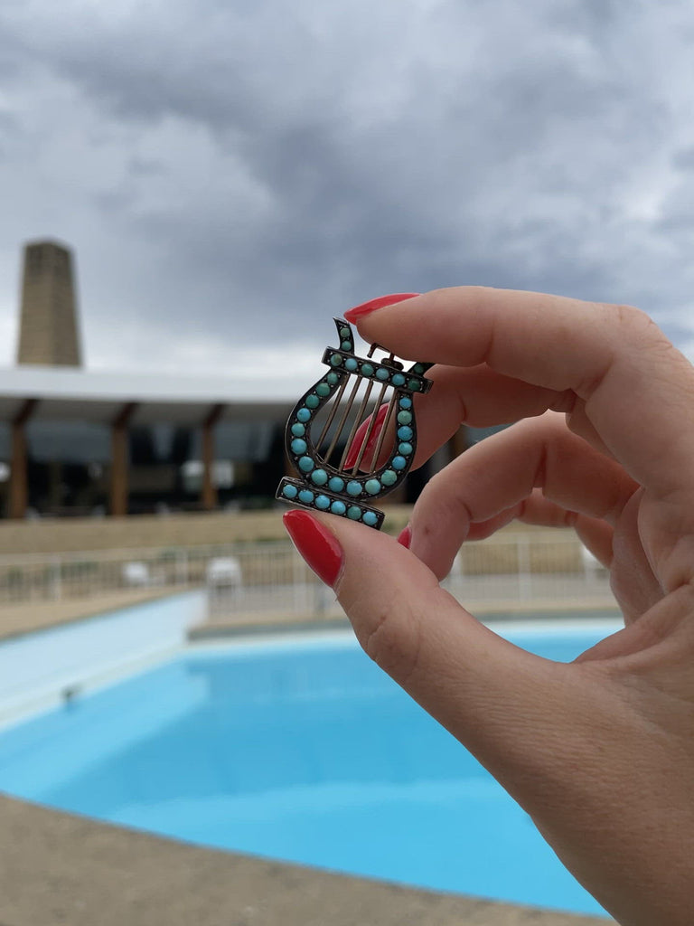 Rare silver pendant (hallmark: boar) in the shape of a lyre entirely paved with turquoise cabochons.