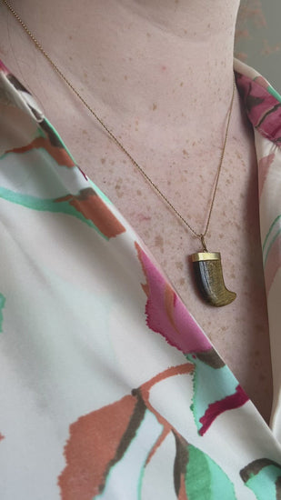 18Kt yellow gold amulet pendant with a tiger's eye carved in the shape of a claw.