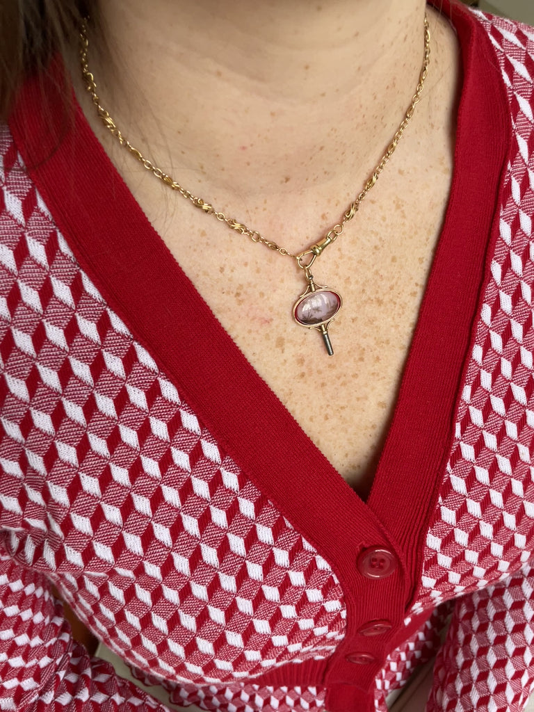 Pendant, key of pocket watch decorated with a miniature on opalescent glass representing a landscape.